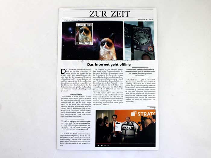 Das Essay “Das Internet geht Offline – Eine Studie zur popkulturellen Entwicklung der Digitalen Gesellschaft” ist Teil der experimentellen Forschungsarbeit und bildet die theoretische Vorbertrachtung in der Auseinandersetzung mit dem Begriff der „Digitalen Gesellschaft“ aus medienökologischer Sicht und der beobachteten Alltäglichkeit des Internets. Hieraus sind zehn (physische) Objekte entstanden, die einzelne Facetten aufgreifen und diese durch ihre Ausgestaltung reflektieren.